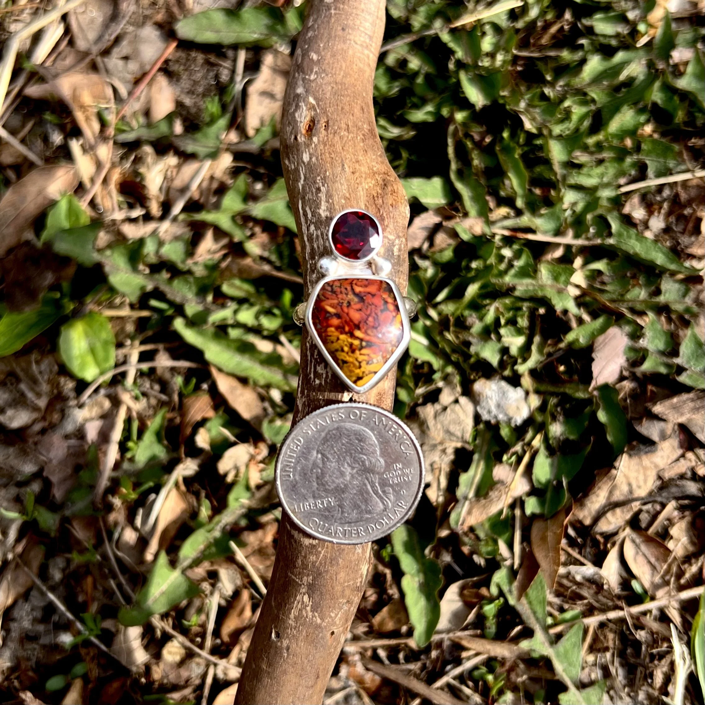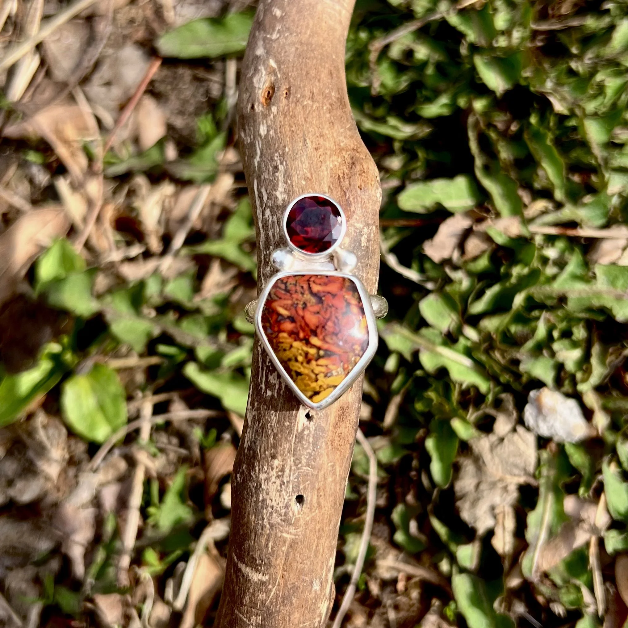Handmade in sterling silver. Size 8 but will resize for free upon purchase, just specify desired size in notes when ordering. Thank you!